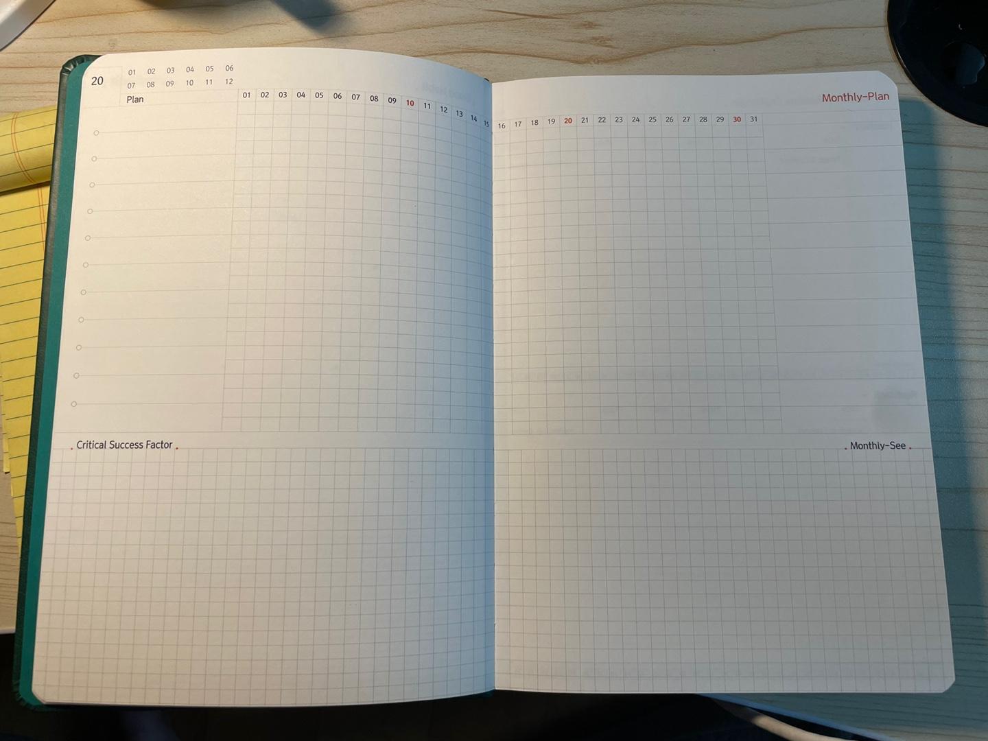 먼슬리플랜조차도 다른 다이어리와 달리 크리티컬 석세스 팩터를 쓰고 일자별 진척도도 사용할 수 있는 등 매우 세밀한 다이어리하고 할 수 있습니다.