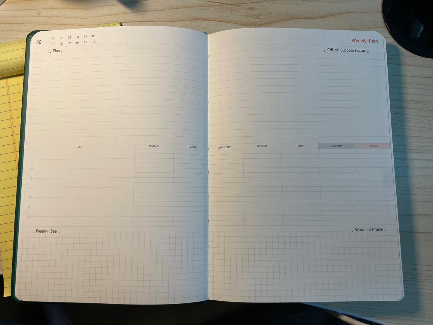 월간 스케줄이 지나면 이번엔 주간단위의 플랜을 세우을 수 있는 페지이가 있습니다. 이는 월간 단위의 계획을 더 세분화하고 주간단위에서 이룰 구체적인 액션을 적는 페이지라고 보면 될 것 같습니다. 정말 디테일 합니다.