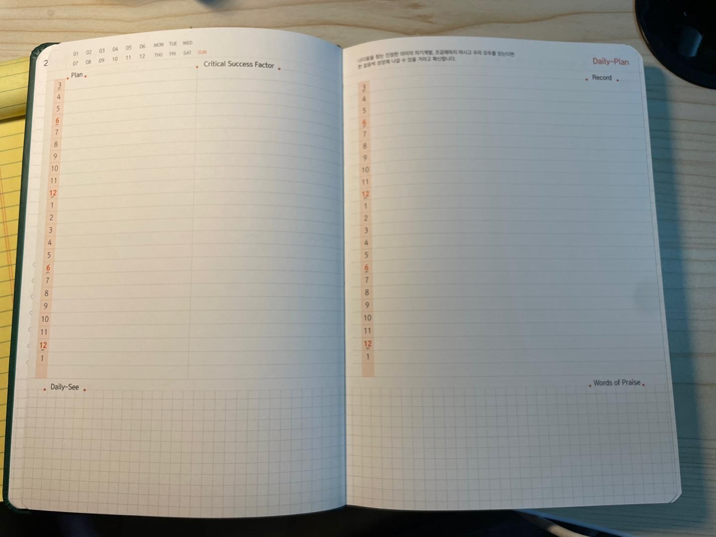 드디어 데일리 페이지가 나타났습니다. 데일리 페이지는 왼쪽면의 계획과 오른쪽면의 실제사용한 시간을 기록하게 하여, 계획대비 시간 사용을 구체적으로 볼 수 있게 구성되어 있을 뿐만 아니라 왼쪽에는 하루를 돌아보고 오른쪽면에는 긍정 확언이나 감사함을 기록할 수 있는 부분도 있습니다. 왼쪽 페이지의 계획부분 옆에는 그날의 크리티컬 석세스 팩터까지 기록할 수 있어 하루를 꼼꼼히 계획하고 준비하고, 실천하고 돌아볼 수 있게 구성되어 있습니다.