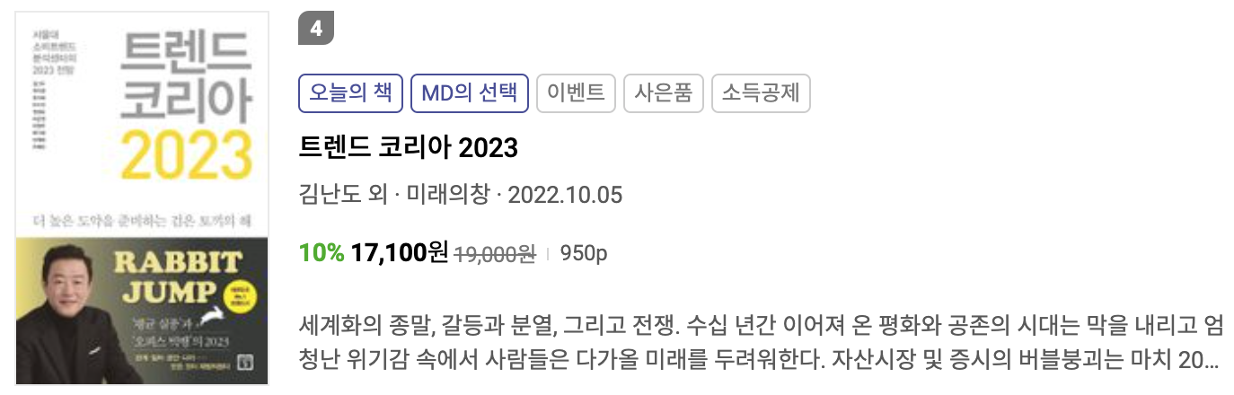 1월 3주차 주간 베스트셀러 4위는 김난도 님의 "트렌드 코리아 2023" 입니다.