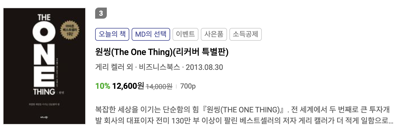1월 3주차 주간 베스트셀러 3위는 게리 켈러의 "원씽(The One Thing)" 입니다.