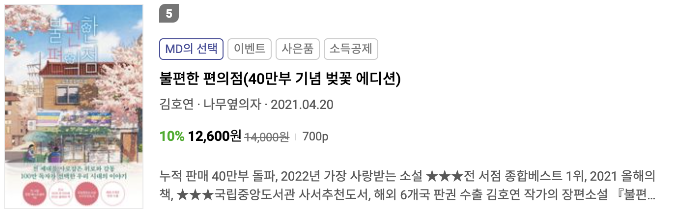 1월 3주차 주간 베스트셀러 5위는 김호연 님의 "불편한 편의점" 입니다.