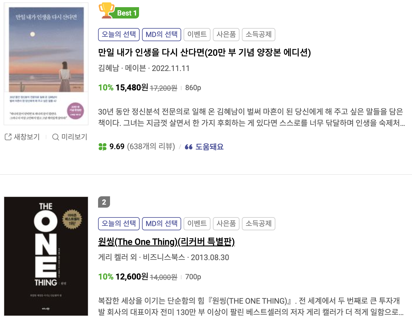 이번주 1위는 지난주와 동일하게 "만일 내가 인생을 다시 산다면"입니다. 트렌드코리아2023을 밀어내고 올라온 뒤로 꾸준히 1등을 유지하고 있습니다. 책 내용이 워낙 좋기 때문에 제가 봐도 그럴만한 도서라고 생각됩니다.