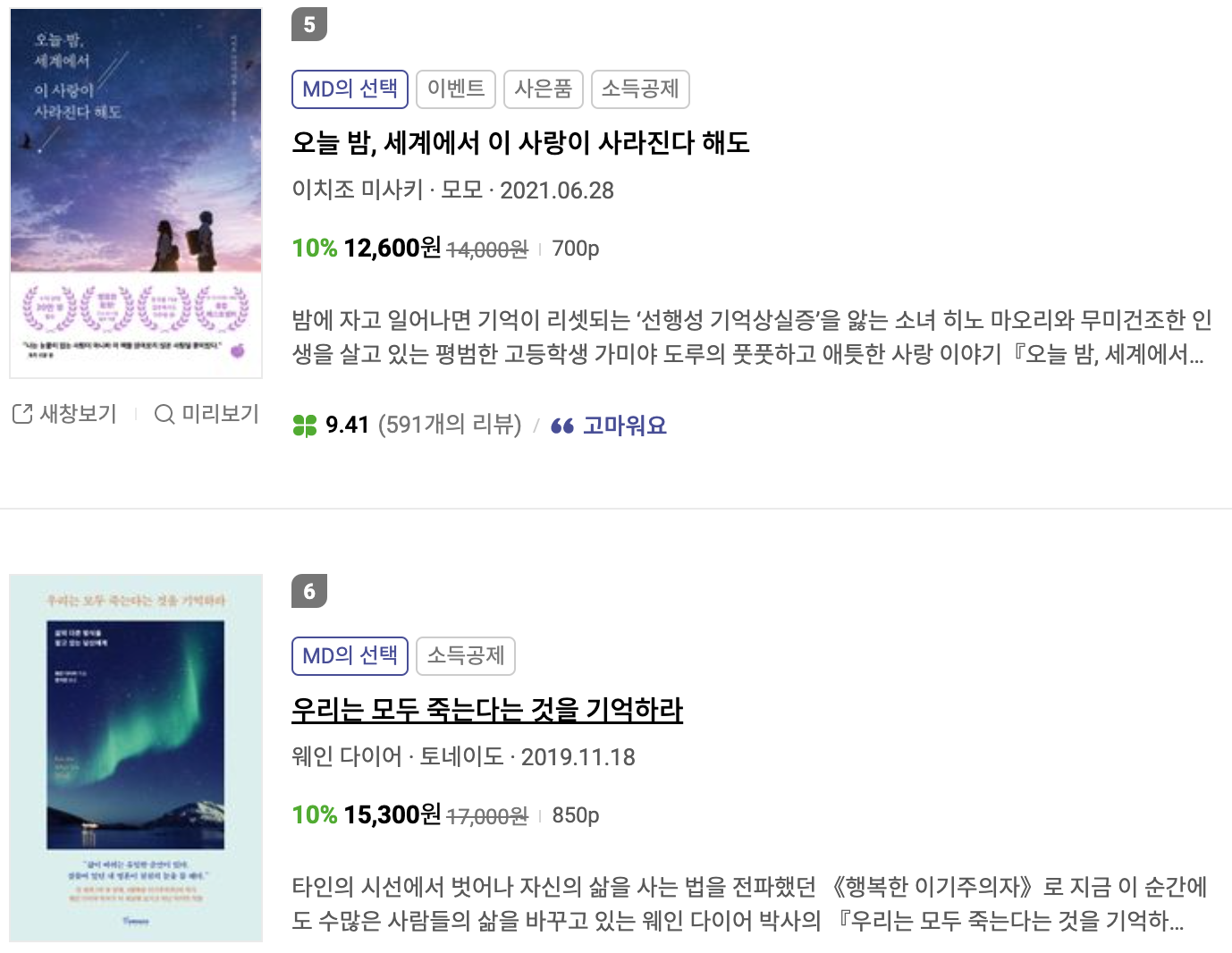 5위는 지난주 7위에서 올라온 "오늘 밤, 세계에서 이 사랑이 사라진다 해도" 입니다. 이제 약간의 변화가 시작되는 것 같습니다. 일본 도서로 영화와 함께 꾸준한 인기를 이어가고 있습니다. (최근에 히가시노 게이고 신작도 나온것 같던데. 요즘은 좀 조용하네요)