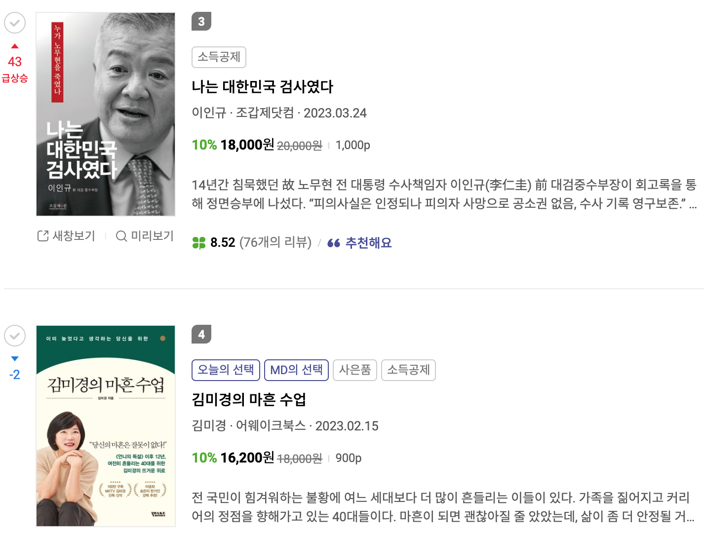 3위는 갑작스럽게 급상승한 이인규의 도서입니다. 워낙 정치적으로 이슈가 있다보니 급상승한 것으로 보입니다. 보통 정치도서는 출간 후 급상승 했다가 내려가는 경향이 있어 얼마나 베스트셀러에서 유지될지는 지켜봐야 할 것 같습니다. (한편으로 정치 도서가 순위가 급상승하는 것은 다른 책들의 판매량이 적다는 반문일 수도 있을 것 같습니다만..)