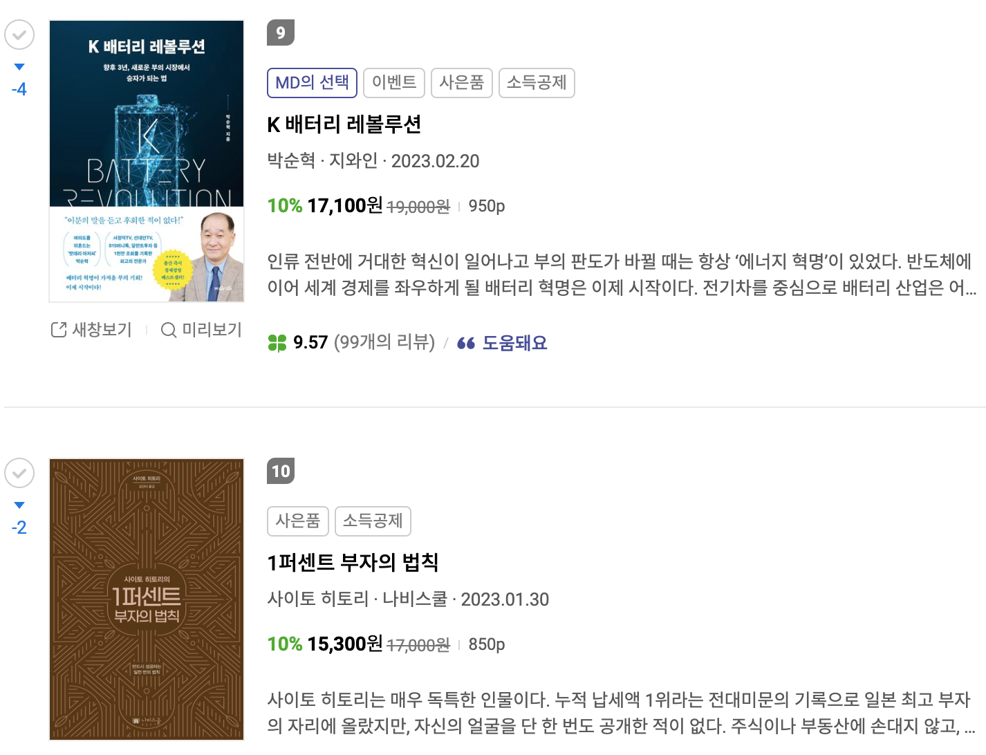 9위는 박순혁의 "K배터리 레볼루션"입니다. 배터리 시장이 주식시장에서 핫한만큼 지난주보다 4단계 내려오긴 했지만 꾸준히 베스트셀러 자리를 지키고 있습니다.