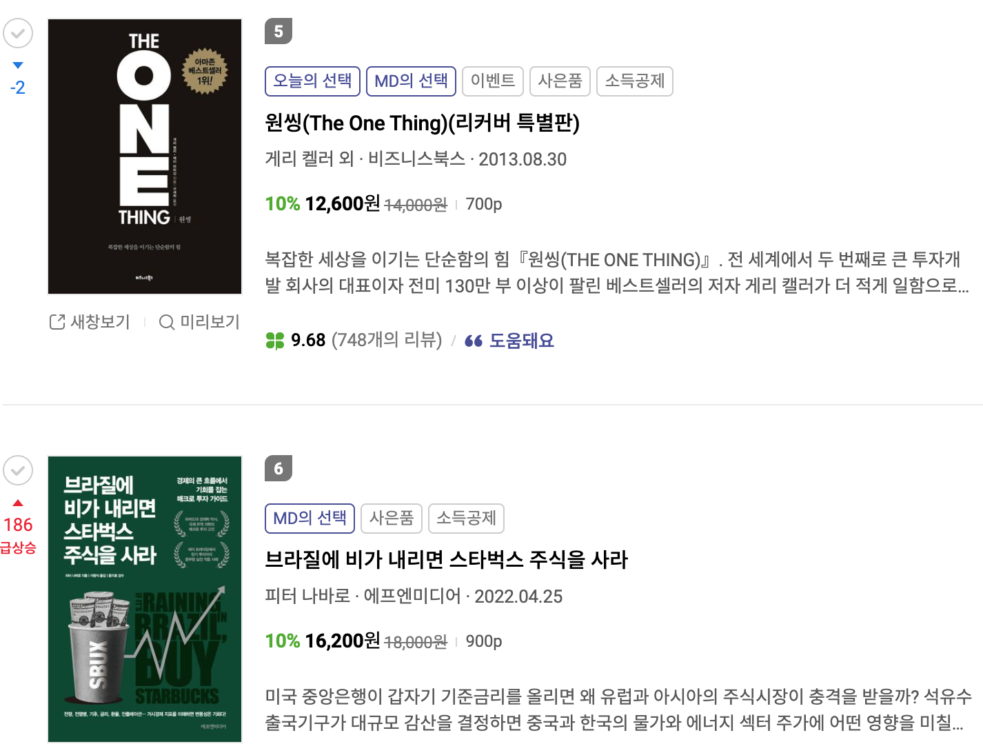 6위는 갑자기(?) 피터 나바로의 "브라질에 비가 내리면 스타벅스 주식을 사라"입니다. 좋은 책이지만 나온지 좀 된 도서인데.. 무슨 일인지 보니, 온라인에서 역주행을 하면서 절판했던 도서가 재출간된 점이 급상승 요인이 되었던 것 같습니다.
