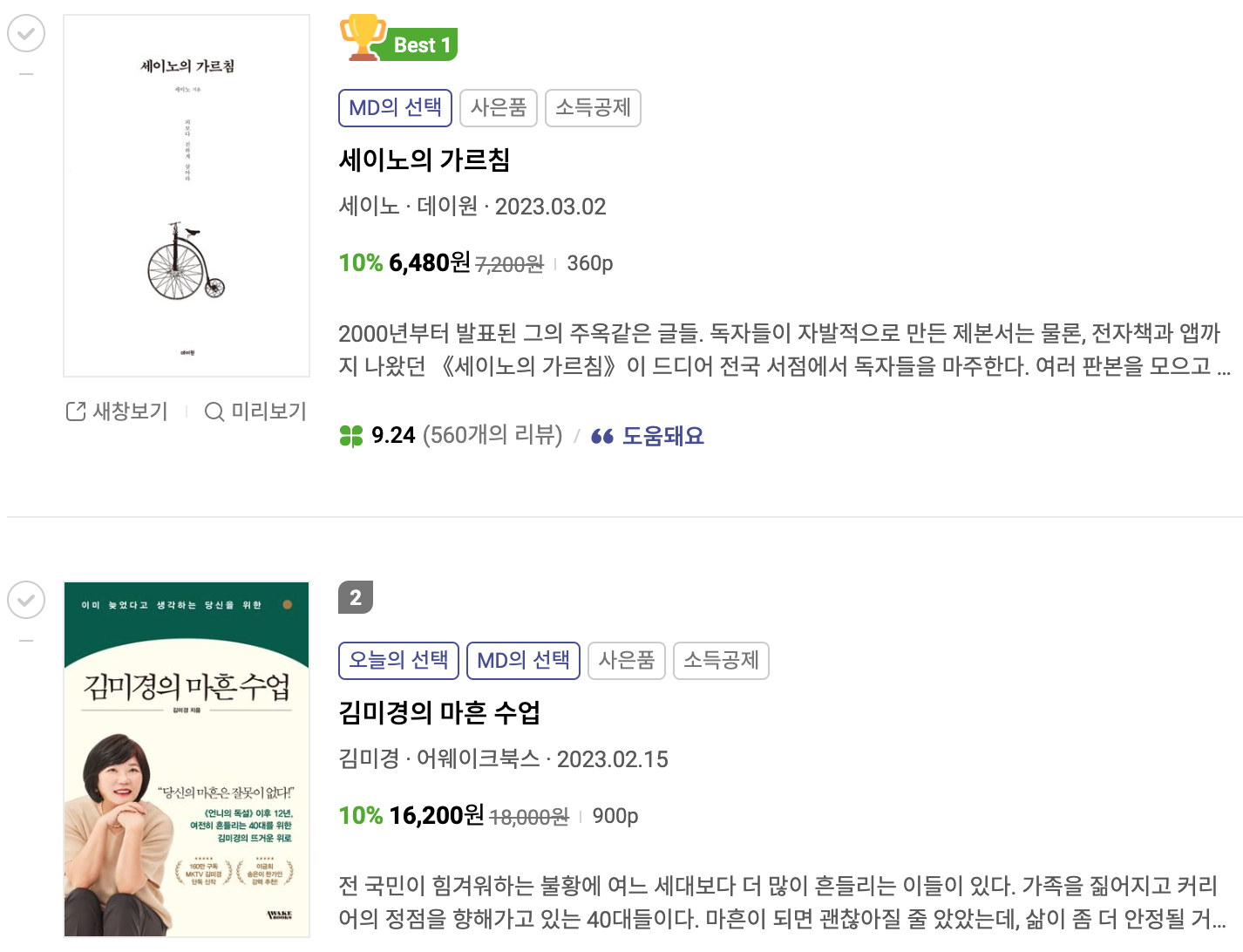 | 3월30일 주간 베스트셀러 교보문고 종합 순위. 3월 마지막주 인기도서는? (0) | 2023.03.31 |