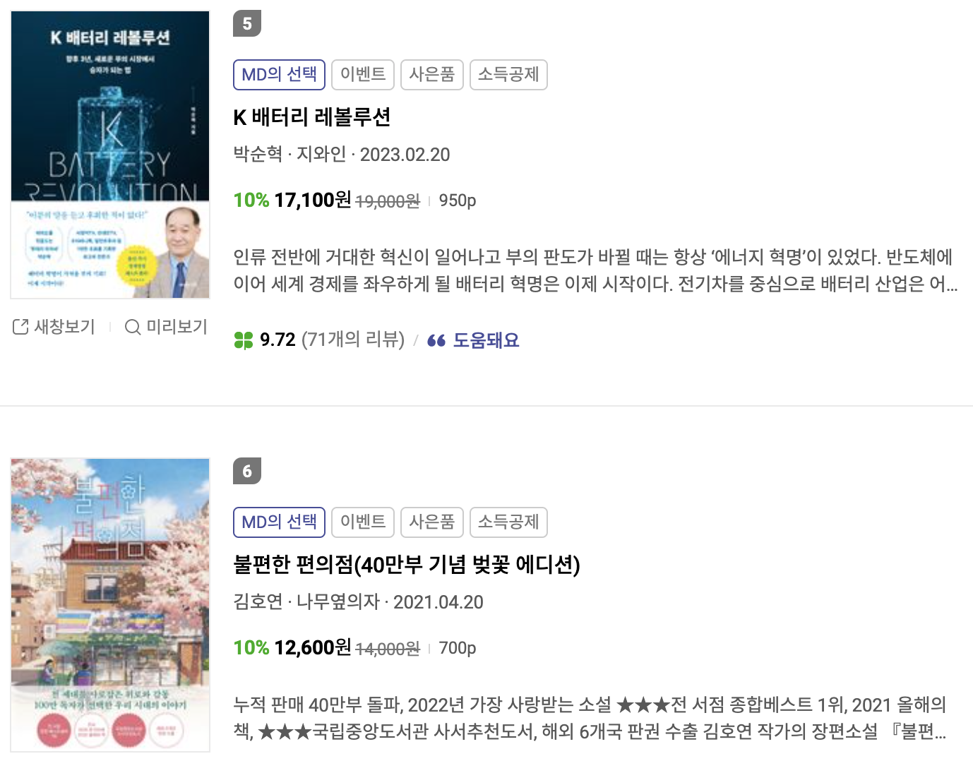 5위도 지난주와 동일하게 박순혁님의 "K배터리 레볼루션"(지와인)입니다. 밧데리 아저씨로 유명한 박순혁님의 책으로 최근 2차전지 관련 주식들의 급등과 함께 인기도 꾸준하게 이어지는 것 같습니다. (저는 아직 읽어보지는 못했습니다. 주식이 다른 곳에 다 물려있어서...흑)
