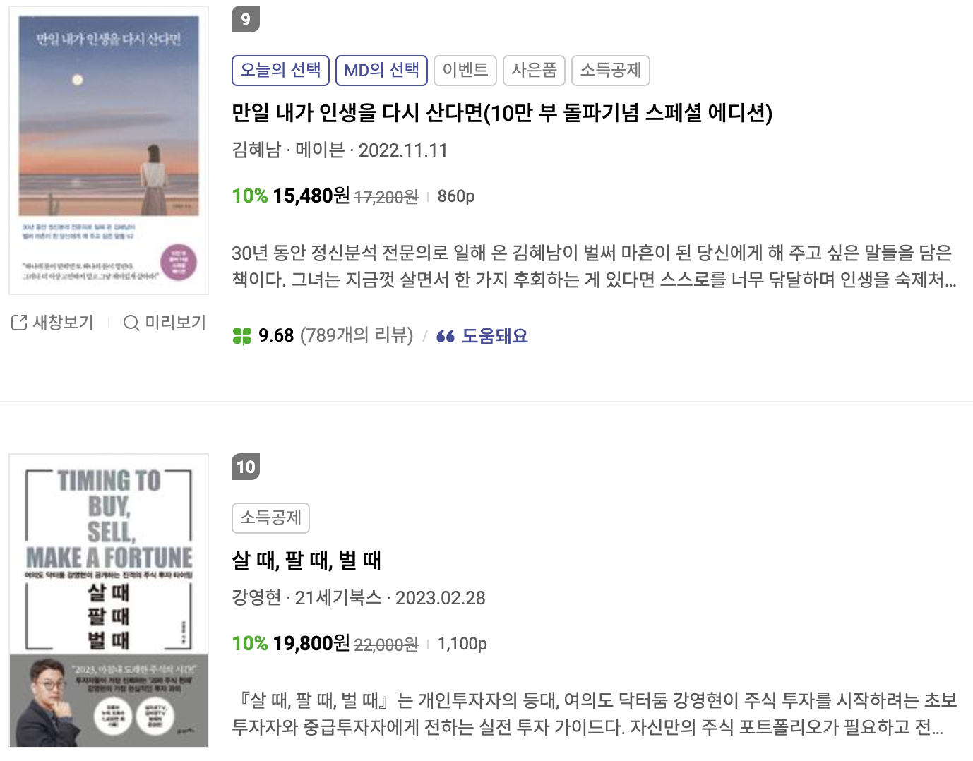 9위는 김혜남님의 "만일 내가 인생을 다시 산다면"(메이븐)입니다. 오랜기간 꾸준하게 사랑받고 있지만, 조금씩 순위가 하락하고 있어 다음주에도 TOP10에 있을지는 모르겠습니다. 내용은 정말 좋습니다.